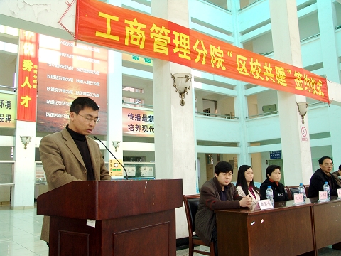 分院党总支副书记刘青春致开幕词。分团委曲再鸣书记代表工商管理分院团委与湖州龙泉街道的东白鱼潭社区,潜庄社区,华丰一区,市陌二、四社区、市陌五大社区的代表签署协议并交换文本。
